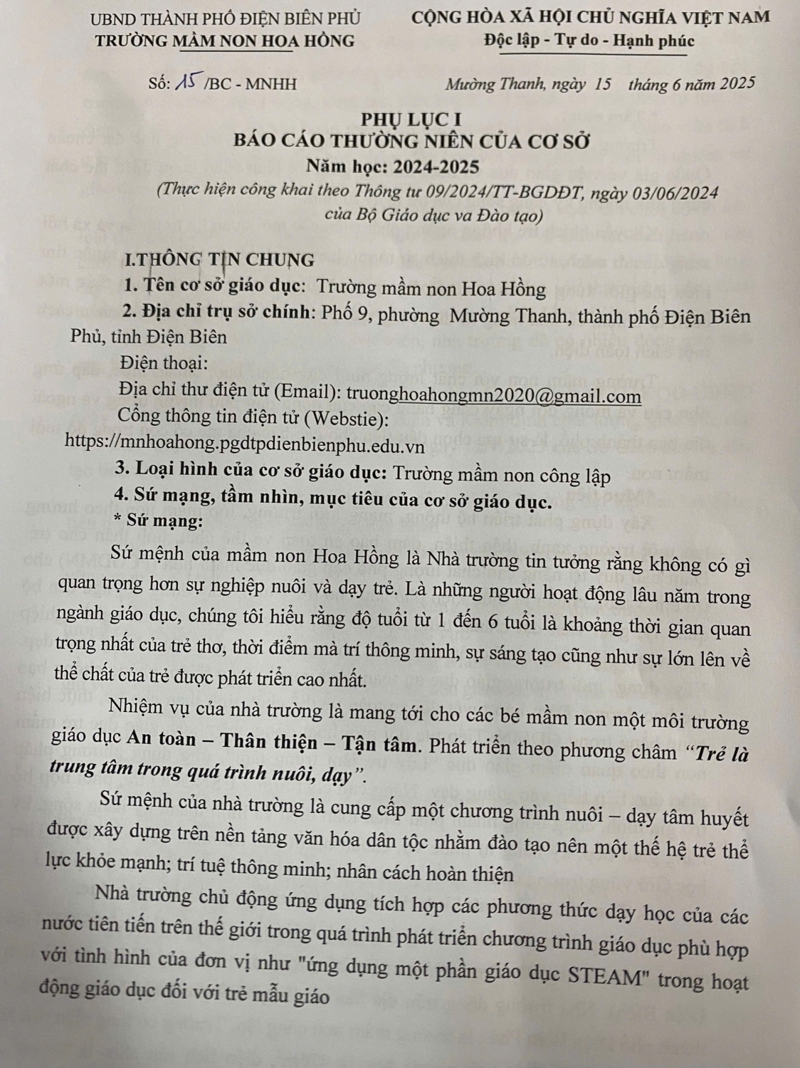 PHỤ LỤC I - BC THƯỜNG NIÊN CỦA CƠ SỞ - TRƯỜNG MẦM NON HOA HỒNG - NĂM HỌC 2024 - 2025.